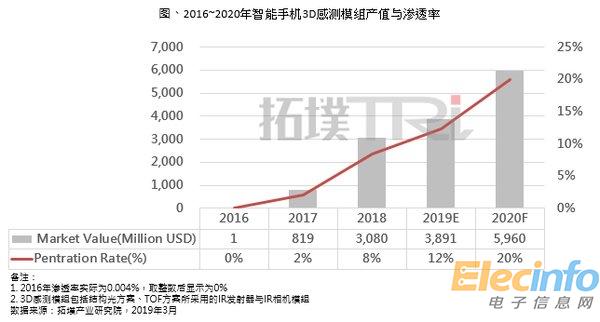 隨著2020年蘋(píng)果有望推出搭載TOF方案的3D感測(cè)模塊的新機(jī),再搭配AR應(yīng)用的推出,將有望再次吸引其他品牌廠商的跟進(jìn),進(jìn)而加速3D感測(cè)市場(chǎng)的發(fā)展。預(yù)估2020年全球智能型手機(jī)3D感測(cè)市場(chǎng)規(guī)模將會(huì)成長(zhǎng)到59.6億美元,滲透率可望提升至20%。