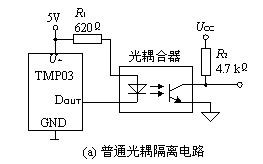 (a)圖為普通光耦隔離電路。TMP03能夠承受5 mA以下的灌電流,可直接與光耦中LED發(fā)光二極管的陰極連通。此時(shí)上拉電阻 R1還起到限流作用,防止LED過(guò)流損壞。取 R1=620歐姆,當(dāng)DOUT端呈低電平時(shí),灌電流小于1 mA,LED上的正向壓降僅為1 V左右。需要注意的是,光耦合器的開(kāi)啟和關(guān)閉時(shí)間必須完全相同,否則會(huì)導(dǎo)致被傳輸?shù)臄?shù)據(jù) 發(fā)生錯(cuò)誤。某些達(dá)林頓型光耦合器(例如4N32)的開(kāi)啟時(shí)間遠(yuǎn)大于關(guān)閉時(shí)間,不能在此使用。