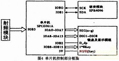 本設(shè)計(jì)的控制核心采用凌陽公司的16位單片機(jī)SPcE061A,語音存儲(chǔ)采用凌陽公司的SPR4096芯片,鍵盤及顯示采用凌陽公司的鍵盤及顯示模塊??刂齐娐吩砣鐖D4所示。