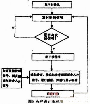 程序設(shè)計(jì)流程如圖5所示。首先對(duì)系統(tǒng)進(jìn)行初始化,確定公交車的初始位置(默認(rèn)為從起始站出發(fā))。在公交車運(yùn)行過程中,不斷發(fā)射射頻信號(hào),當(dāng)靠近某一站臺(tái)的射頻卡時(shí),首先進(jìn)行識(shí)別檢驗(yàn),檢驗(yàn)是否為干擾信號(hào),若是干擾信號(hào),則繼續(xù)發(fā)射射頻信號(hào),若不是則對(duì)反射回的射頻信號(hào)送入單片機(jī)進(jìn)行識(shí)別,單片機(jī)程序采用查詢模式,識(shí)別站臺(tái)出的身份后,調(diào)用語音模塊中相應(yīng)的語音信息和寄存器中的站臺(tái)文字信息分別送到音響和顯示屏進(jìn)行語音播報(bào)和顯示。系統(tǒng)安裝手動(dòng)控制電路,用以解決一些特殊和意外情況。