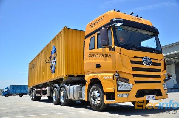 5月24日下午3時(shí),在蘇寧物流上海奉賢園區(qū),一輛掛載著集裝箱的重型卡車行駛在園區(qū)的道路上。車輛行駛得平穩(wěn)、順暢,右轉(zhuǎn)彎時(shí),車頭完成了一個(gè)很自然的半圓,又勻速調(diào)整了車頭方位,緩緩加速向前。