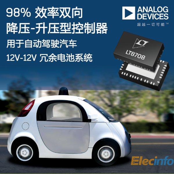 -Analog Devices, Inc (ADI) 宣布推出 Power by Linear(TM) LT8708/-1,這款效率達 98% 的雙向降壓-升壓型開關(guān)穩(wěn)壓控制器在兩個具有相同電壓的電池之間運行,非常適合在自動駕駛汽車中提供冗余電源。LT8708/-1 利用一個輸入電壓供電運行,該輸入電壓可以高于、低于或等于輸出電壓,這使其十分適合電動汽車和混合動力汽車中常見的兩個各為 12V、24V 或 48V 的電池。該器件在兩個電池之間運行,可避免在其中一個電池出現(xiàn)故障的情況下發(fā)生系統(tǒng)停機。另外,LT8708/-1 還可在 48V/12V 和 48V/24V 雙電池系統(tǒng)中使用。