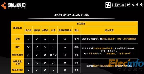 通常用的股權(quán)激勵的工具有這么幾類:一類是實股,適用于公司最核心的合伙人或高管;另一類是期權(quán)和限制性股票,適合于暫時無利潤、現(xiàn)金流寶貴、企業(yè)前景較好的公司;對于上市公司而言,股權(quán)激勵屬于“老板請客,二級市場買單”;還有一種是業(yè)績獎金/干股和虛擬受限股,這兩種適合有穩(wěn)定利潤且現(xiàn)金流好,發(fā)展空間大的企業(yè)。