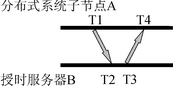 假設(shè)子節(jié)點(diǎn)A要向服務(wù)器方B請求時(shí)間服務(wù)。A首先要生成一個(gè)標(biāo)準(zhǔn)的NTP查詢信息包,通過網(wǎng)絡(luò)發(fā)送到B。B收到查詢信息包后,根據(jù)自己的本地時(shí)間,生成一個(gè)標(biāo)準(zhǔn)的NTP時(shí)間信息包,通過網(wǎng)絡(luò)發(fā)回給A。分布式系統(tǒng)中的NTP實(shí)現(xiàn)原理圖如圖1所示。