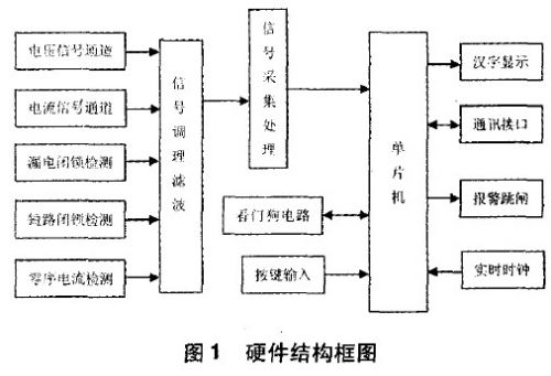 本保護(hù)裝置具有在電動(dòng)機(jī)運(yùn)行時(shí)對電機(jī)進(jìn)行參數(shù)測量、故障保護(hù)、控制、遠(yuǎn)程通訊、故障信息的存儲(chǔ)及查詢等功能。保護(hù)裝置通過傳感器對主回路的三相電壓、三相電流、零序電流等模擬信號(hào)進(jìn)行檢測,通過單片機(jī)的運(yùn)算,判斷是否出現(xiàn)故障,若有故障發(fā)生能夠迅速切斷供電并及時(shí)報(bào)警顯示各種故障信息。系統(tǒng)硬件如圖1所示。