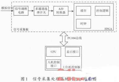 本文的實(shí)時(shí)信號(hào)采集處理系統(tǒng)主要包括信號(hào)采集板和上位機(jī)控制板2部分,兩者之間通過(guò)PC104總線進(jìn)行通信。上位機(jī)控制板以CPU為核心,擴(kuò)展出VGA,RJ45等人機(jī)交互所需要的外圍設(shè)備接口。信號(hào)采集板主要包括了FPGA邏輯控制、A/D轉(zhuǎn)換器、通道選擇開(kāi)關(guān)、前端信號(hào)調(diào)理器等。實(shí)時(shí)信號(hào)采集處理系統(tǒng)的總體結(jié)構(gòu)圖如圖1所示。
