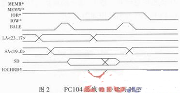 本系統(tǒng)采用深圳盛博公司的PC104模塊SCM9022作為上位機(jī)控制系統(tǒng)硬件平臺(tái),其處理器為英特爾凌動(dòng)N455處理器,使用了1 GB的DDR3內(nèi)存,支持2 GB的SSD和1路SATA接口,支持2個(gè)100 Base-T以太網(wǎng)口,具有8路GPIO接口和6個(gè)串口,4個(gè)USB 2.0接口,標(biāo)準(zhǔn)鼠標(biāo)鍵盤接口,支持18位的LVDS和VGA顯示。SCM9022的硬件資源可以滿足對(duì)所需要采集信號(hào)的處理,用戶可以方便地使用其通用的外設(shè)接口完成必要的人機(jī)交互。上位機(jī)控制板包括了64針腳的雙排單列插針J1和40針腳的雙排單列插針J2,總共104根信號(hào)總線。上位機(jī)控制板是標(biāo)準(zhǔn)的PC104模塊,其尺寸為96 mmx90 mm。當(dāng)工作在8 b數(shù)據(jù)模式下時(shí),J2的針腳信號(hào)無(wú)效,只有J1針腳有效;當(dāng)工作在16 b數(shù)據(jù)模式下時(shí),J1和J2所有針腳都有效。在104個(gè)針腳中,包括了16個(gè)數(shù)據(jù)針腳,7個(gè)鎖存地址針腳,20個(gè)地址針腳,32個(gè)控制針腳,14個(gè)地線和電源線,1個(gè)14 MHz的OSC,1個(gè)8 MHz的BCLK。其中,SA[0..11]為地址總線;SD[0..7]為數(shù)據(jù)總線;IOR為輸入/輸出接口的讀控制,低電平有效;IOW為輸入/輸出接口的寫控制,低電平有效;DATA為串行數(shù)據(jù);BALE為地址鎖存信號(hào);CLK為移位脈沖;SY-CLK為總線時(shí)鐘;IOCHADY為輸入/輸出接口的準(zhǔn)備就緒信號(hào),該信號(hào)由集電極開(kāi)路門或三態(tài)門驅(qū)動(dòng),低電平時(shí)處于無(wú)效狀態(tài),表示輸入/輸出接口設(shè)備需要將總線的周期延長(zhǎng)。時(shí)序如圖2所示。
